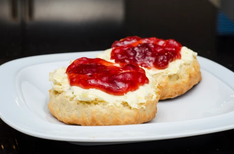 - Use a knife to slather on cream and jam onto the broken-off piece of scone.